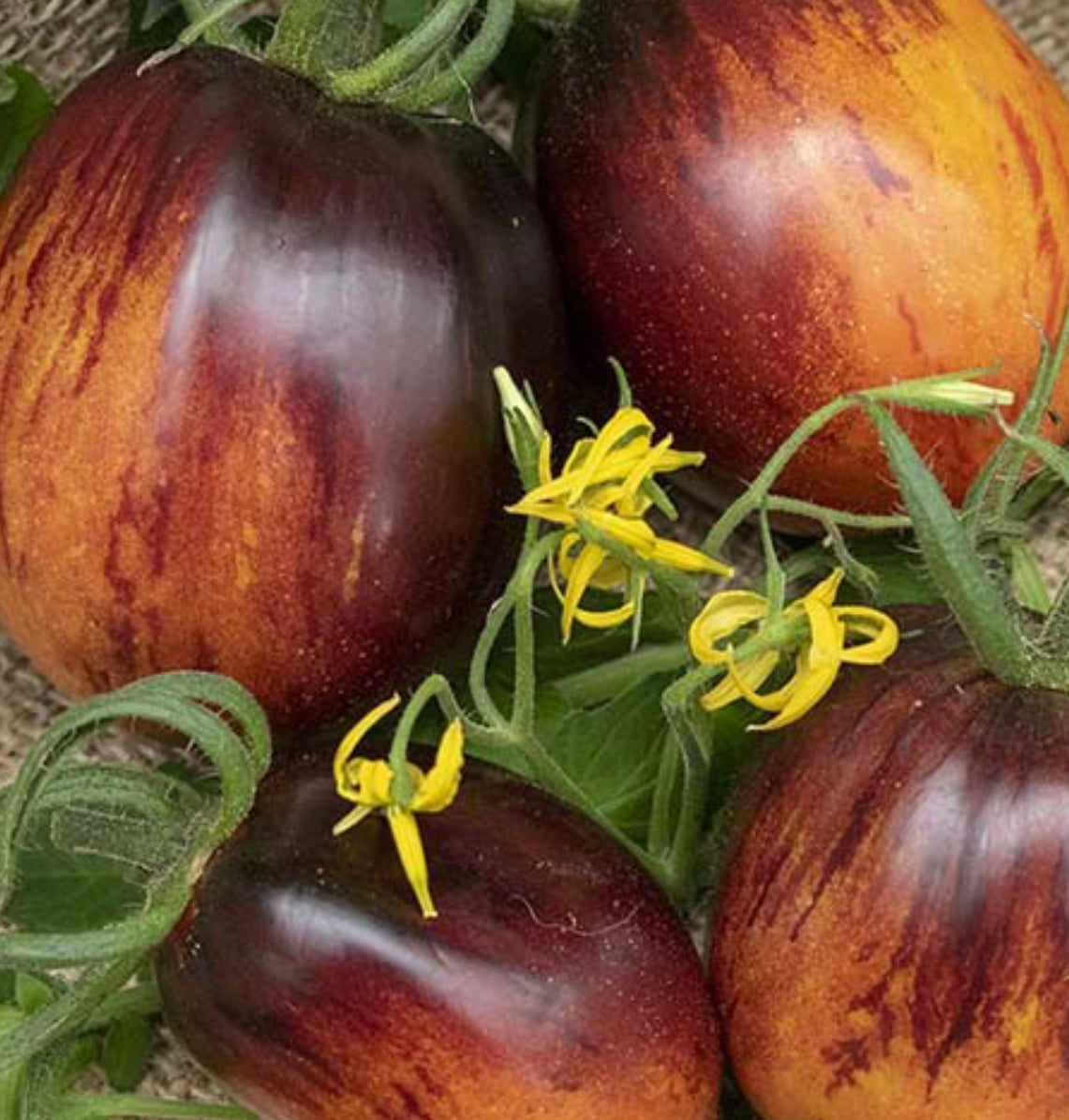 This salad tomato is very beautiful, even when it's unripe. It's green with blue shoulders and stripes and marbles. It's almost indescribable. The tomatoes ripen to red flamed/striped with blue shoulders. The flavour is slightly acid with a full tomato flavour and somewhat sweet. The flavour is very good especially for a blue tomato.
